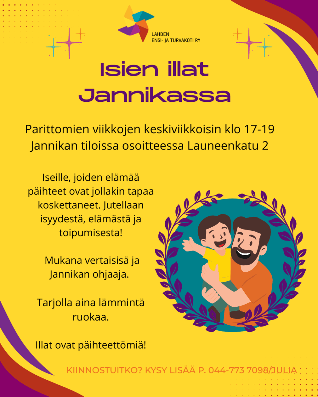 Jannikan avoimessa yhteisössä on mahdollisuus tavata pikkulapsiperheiden vanhempia, joita kaikkia päihteet on jollain tapaa koskettaneet. Voit olla itse toipuva vanhempi tai perheessäsi on jollakin lapsen läheisellä ollut päihteiden käyttöä tai on edelleen. Olet tervetullut myös jos omassa lapsuudessasi olet kohdannut päihteiden käyttöä ja olet nyt pikkulapsiperheen vanhempi. Tule rohkeasti paikalle tai halutesssasi voit kysyä lisää p. 044-773 7098. Ennakkoilmoittautumista ei tarvita.