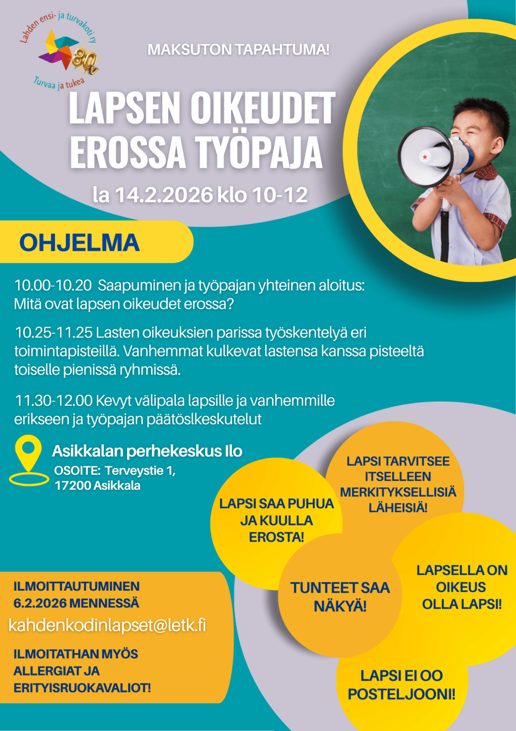 Tervetuloa Asikkalan perhekeskus Iloon yhdessä lapsesi kanssa tutustumaan lapsen oikeuksiin erossa. Työskentely tapahtuu pisteeltä toiselle. Vanhemmat siirtyvät yhdessä lastensa kanssa pisteeltä toiselle ja lopuksi keskustellaan ja syödään välipalaa. Ilmoittaudu mukaan!